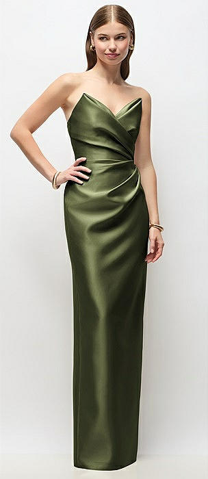 Strapless Asymmetrical Draped Satin Column Maxi Dress in olive green
