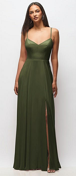 Bow-Shoulder V-Back Chiffon Gown with Front Slit in olive green