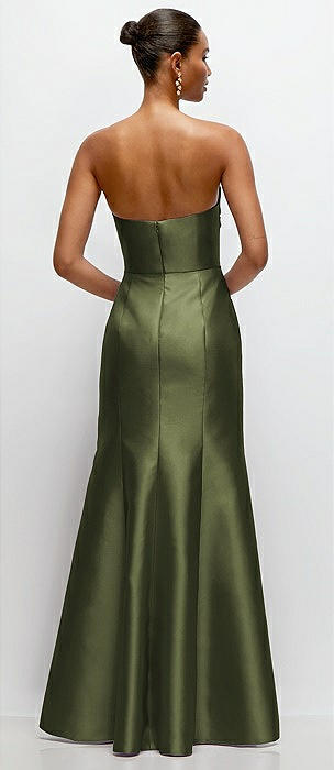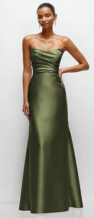 Strapless Cat-Eye Draped Bodice Satin Tumpet Dress in olive green