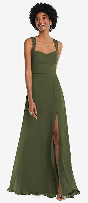 Square-Neck Satin A-line Maxi Dress with Front Slit in olive green