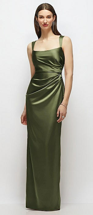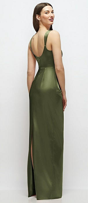 Scoop Neck Draped Column Stretch Satin Maxi Dress in olive green