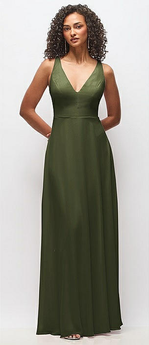 Plunge Neckline Bow Shoulder Empire Waist Chiffon Maxi Dress in olive green