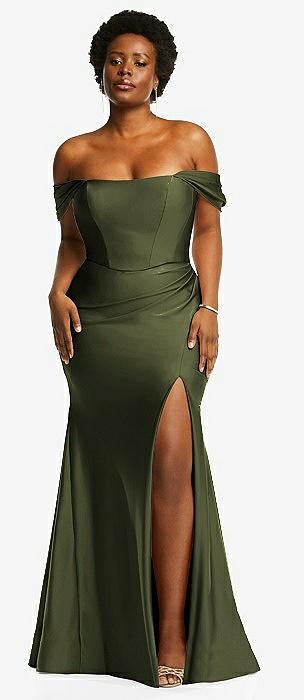 Off-the-Shoulder Corset Stretch Satin Mermaid Dress with Slight Train in olive green