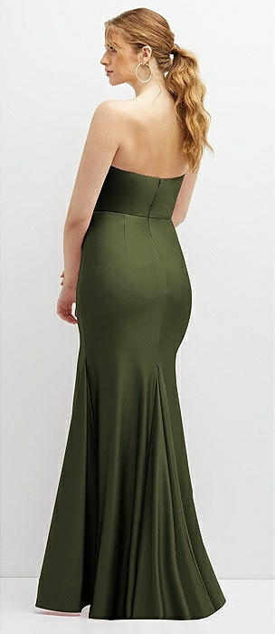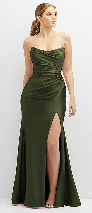 Strapless Basque-Neck Draped Stretch Satin Mermaid Dress with Horsehair Hem in olive green