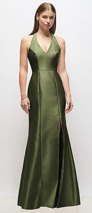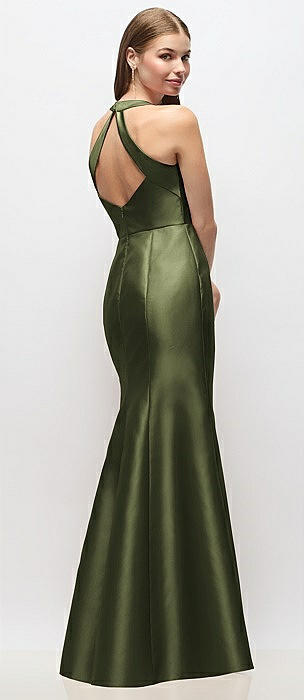 Criss Cross Halter Open-Back Stretch Satin Mermaid Dress in olive green