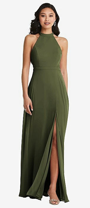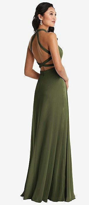 Stand Collar Halter Maxi Dress with Criss Cross Open-Back in olive green