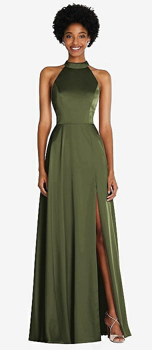 Open Neckline Cutout Satin Twill A-Line Gown with Pockets in olive green