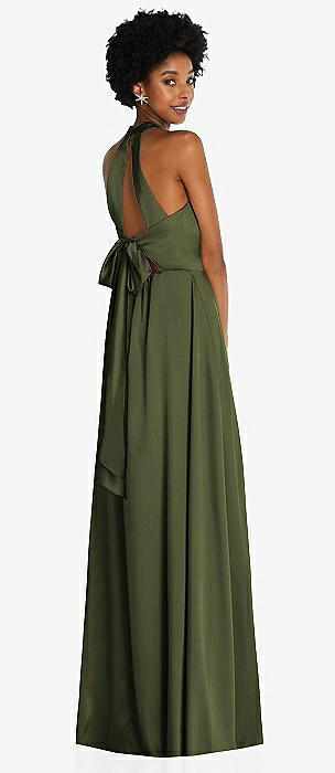High Neck Backless Maxi Dress with Slim Belt in olive green