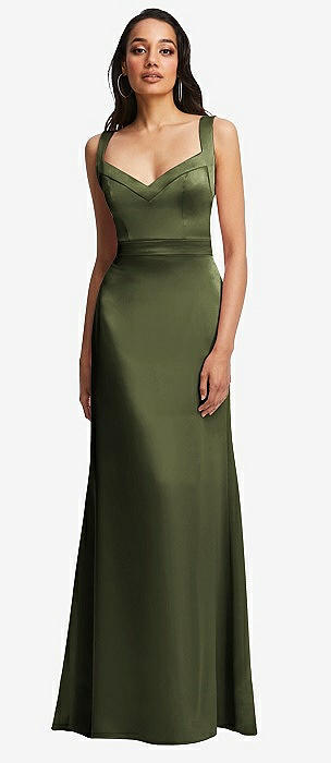 Basque-Neck Strapless Satin Gown with Mini Sash in olive green