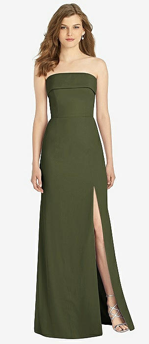 Strapless Satin Gown with Draped Front Slit and Pockets in olive green