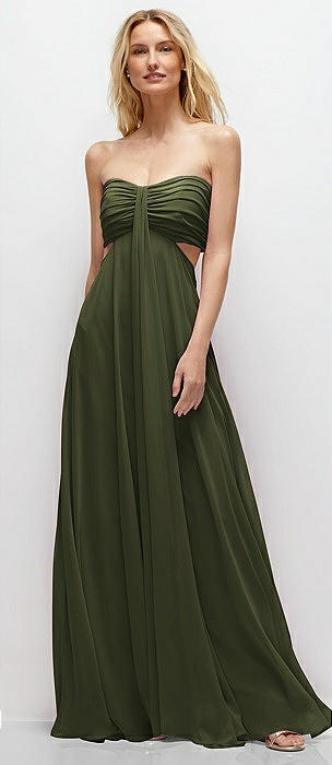 Strapless Empire Waist Cutout Maxi Dress with Covered Button Detail in olive green