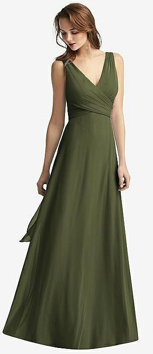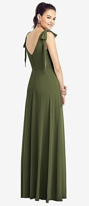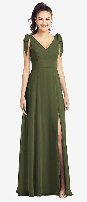 Bow-Shoulder V-Back Chiffon Gown with Front Slit in olive green