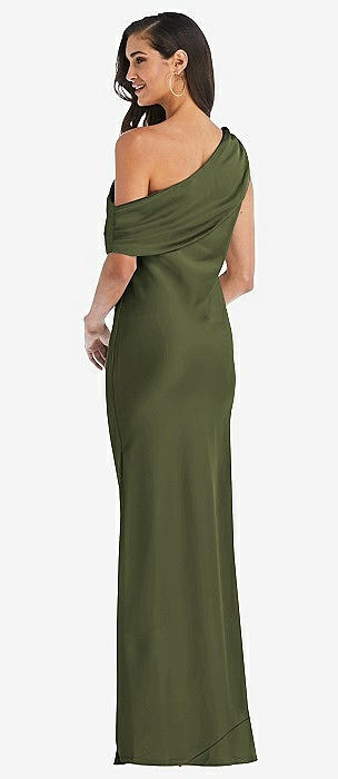 One-Shoulder Satin Gown with Draped Front Slit and Pockets in olive green