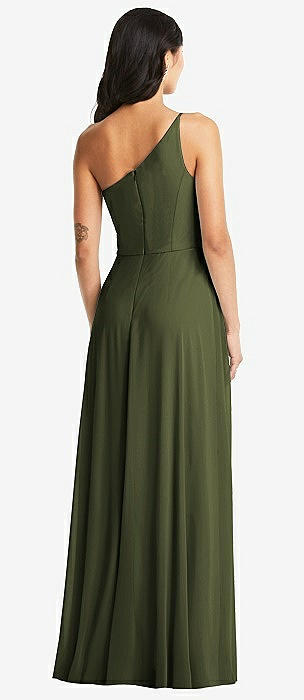 Shirred One-Shoulder Satin Trumpet Dress - Maddie in olive green