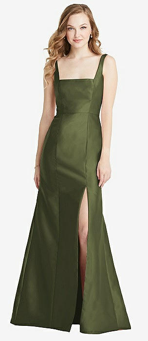 Strapless Satin Gown with Draped Front Slit and Pockets in olive green