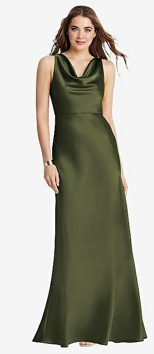 Cowl-Neck Draped Wrap Maxi Dress with Front Slit in olive green