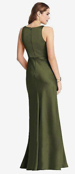 Open Neckline Cutout Satin Twill A-Line Gown with Pockets in olive green
