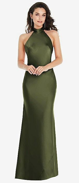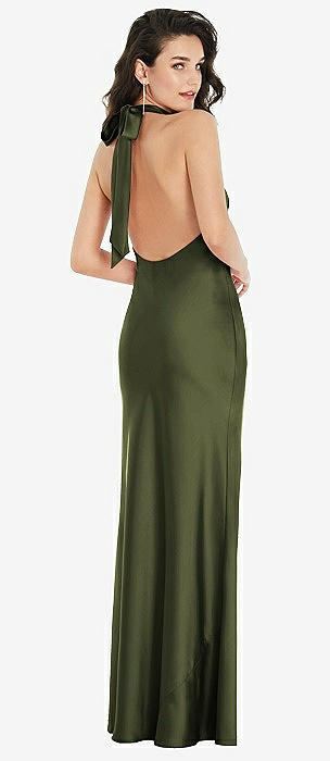 Draped Twist Halter Tie-Back Trumpet Gown in olive green