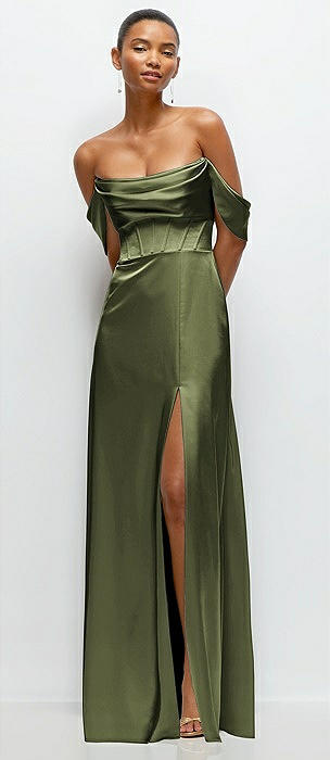Cowl Neck Off-the-Shoulder Stretch Satin Fit and Flare Corset Maxi Dress in olive green