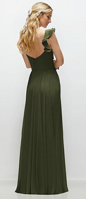 Convertible Ruffle Strap Chiffon Maxi Dress with Full Circle Skirt in olive green