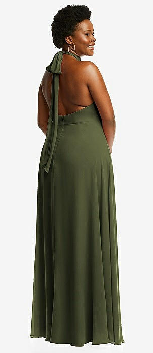 Plunge Halter Open-Back Maxi Bias Dress with Low Tie Back in olive green