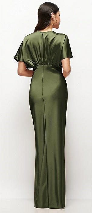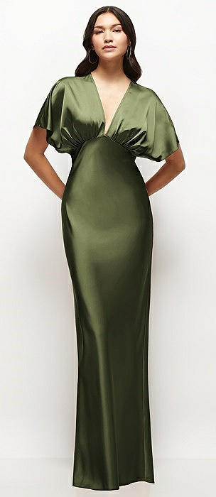 Plunge Neck Kimono Sleeve Satin Bias Maxi Dress in olive green