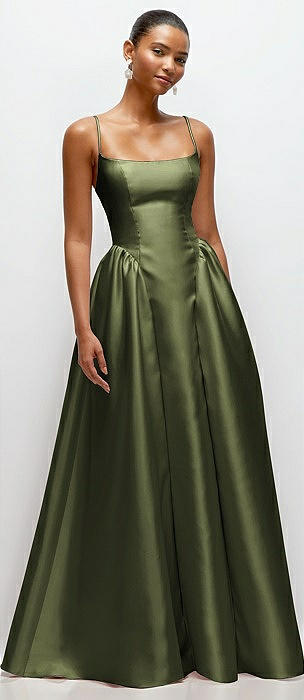 Scoop Neck Drop Basque Skirt Satin Maxi Dress with Pockets in olive green