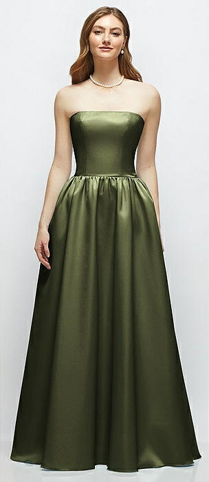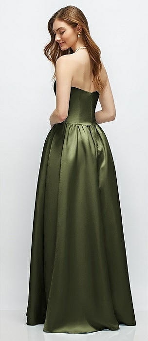 Strapless Basque Drop Waist Chiffon Maxi Dress with Shirred Skirt in olive green