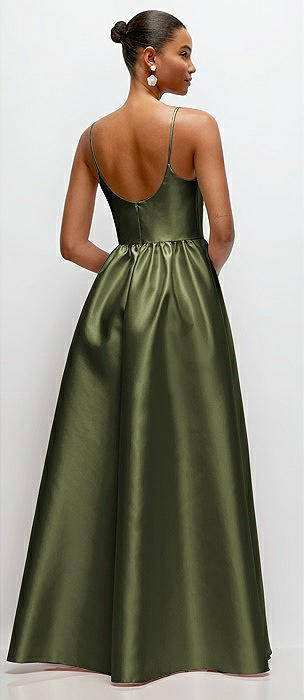 Scoop Neck Drop Basque Skirt Satin Maxi Dress with Pockets in olive green