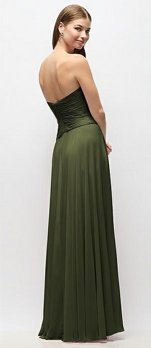 Strapless Basque Drop Waist Chiffon Maxi Dress with Shirred Skirt in olive green