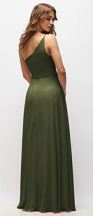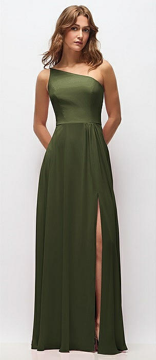 One-Shoulder Chiffon Maxi Dress with Shirred Front Slit in olive green