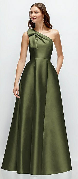 Bow One-Shoulder Full A-Line Satin Maxi Dress in olive green
