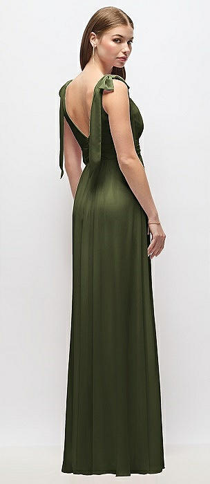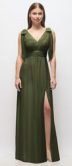 Plunge Neckline Bow Shoulder Empire Waist Chiffon Maxi Dress in olive green