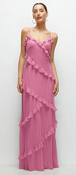 Asymmetrical Ruffle Chiffon Bias Slip Maxi Dress in orchid pink