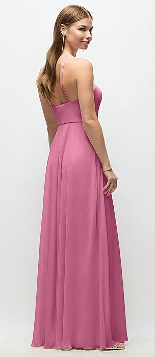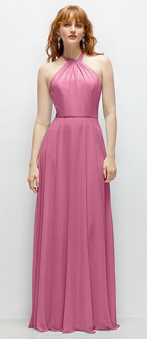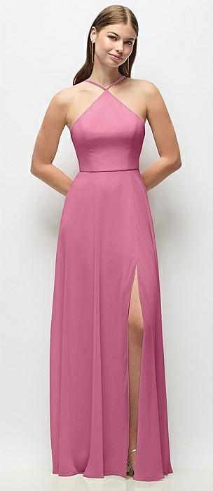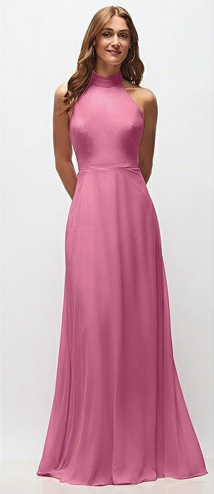 High-Neck Halter Chiffon Maxi Dress with Adjustable Spaghetti Straps in orchid pink