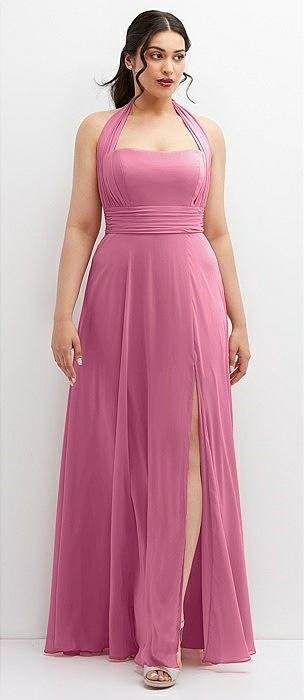 Shirred Skirt Jewel Neck Halter Dress with Front Slit in orchid pink