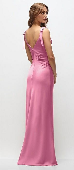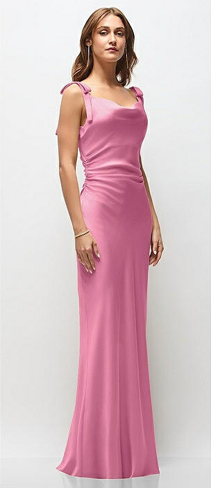 Soft Cowl Neck Ruched Side Satin Bias Maxi Dress with Shoulder Bows in orchid pink