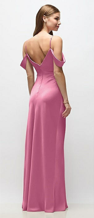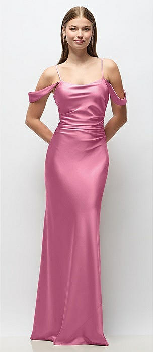 Off-the-Shoulder Swag Ruched Side Satin Bias Maxi Dress with Adjustable Spaghetti Straps in orchid pink