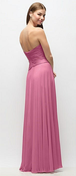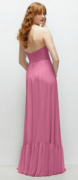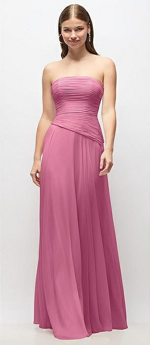 Strapless Chiffon Maxi Dress with Asymmetrical Ruched Drop Waist in orchid pink