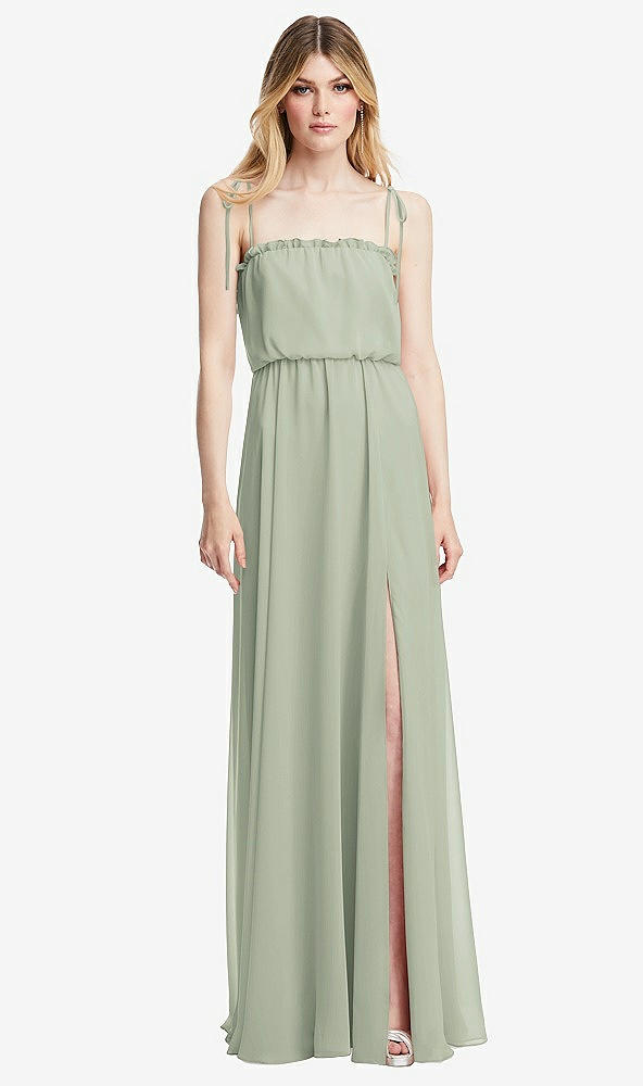 Skinny Tie-Shoulder Ruffle-Trimmed Blouson Maxi Dress in Celadon