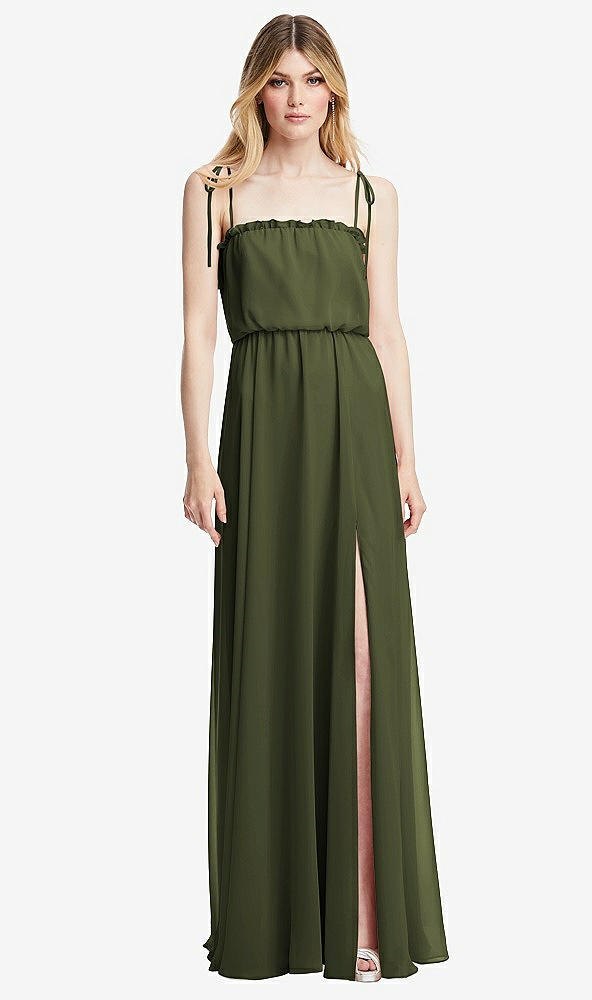 Skinny Tie-Shoulder Ruffle-Trimmed Blouson Maxi Dress in Olive Green