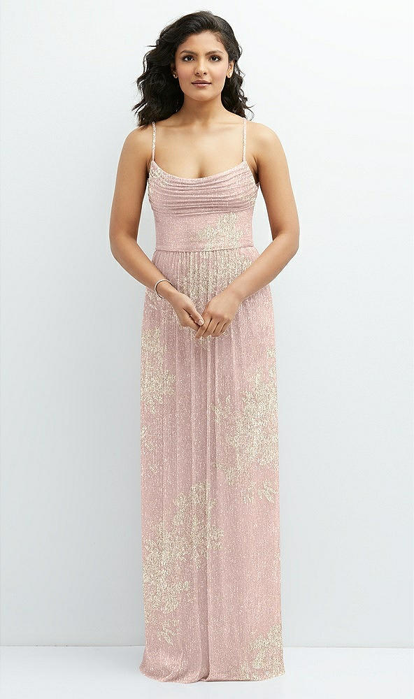 Soft Cowl Neck Metallic Pleated Maxi Dress with Floral Gold Foil Print in Pink Gold Foil
