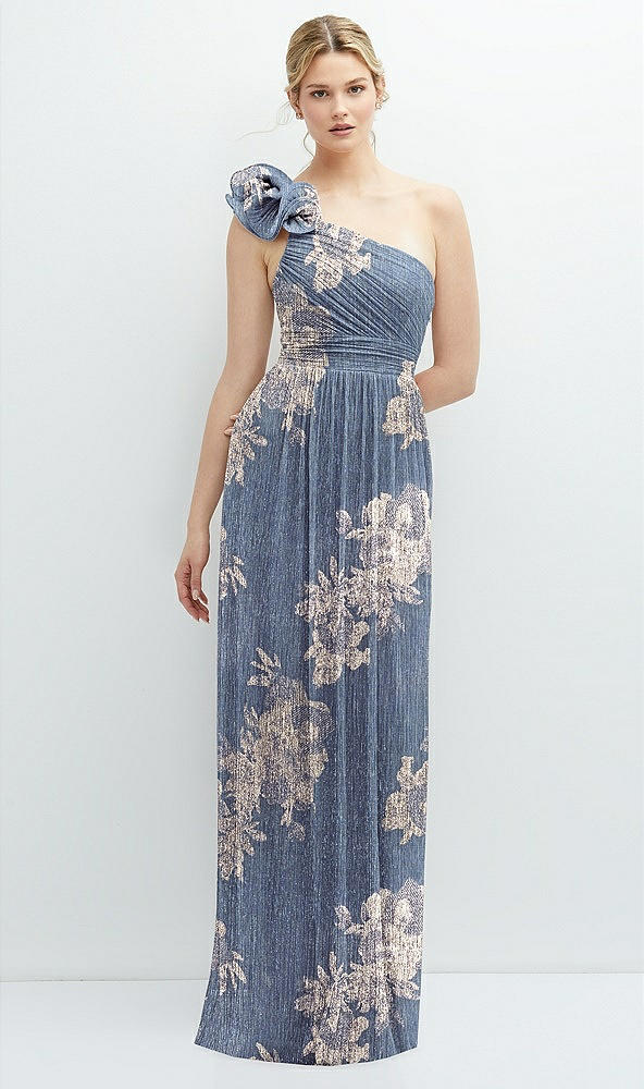 Dramatic Ruffle Edge One-Shoulder Metallic Pleated Maxi Dress with Floral Gold Foil Print in French Blue Gold Foil