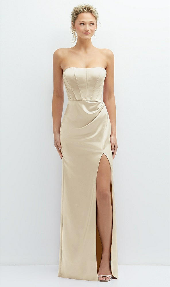 Strapless Topstitched Corset Satin Maxi Dress with Draped Column Skirt in Champagne
