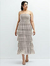 Ruffle Tiered Skirt Metallic Pleated Strapless Midi Dress in Metallic Taupe
