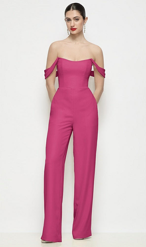 Off-the-Shoulder Basque Neck Crepe Wide Leg Formal Jumpsuit in Tea Rose