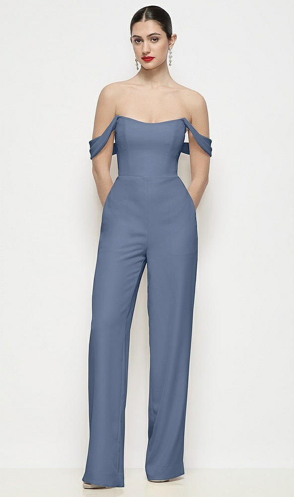 Off-the-Shoulder Basque Neck Crepe Wide Leg Formal Jumpsuit in Larkspur Blue