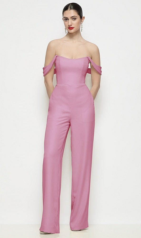 Off-the-Shoulder Basque Neck Crepe Wide Leg Formal Jumpsuit in Powder Pink