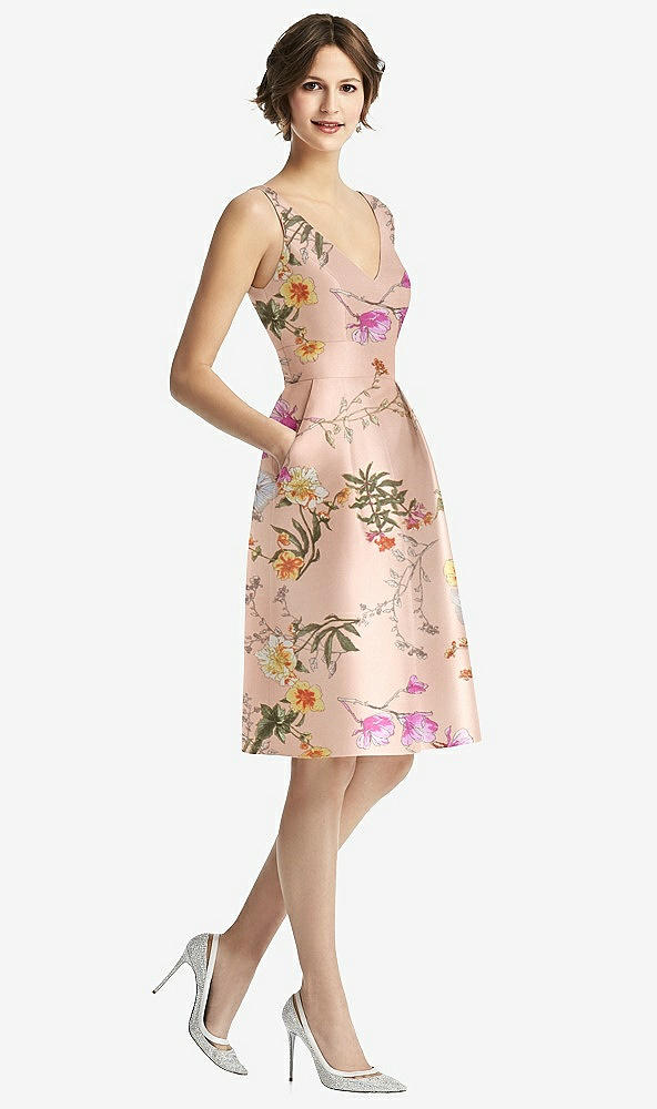 V-Neck Pleated Skirt Floral Satin Cocktail Dress with Pockets in Butterfly Botanica Pink Sand