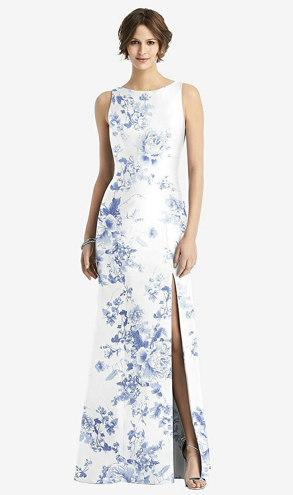 Sleeveless Floral Satin Trumpet Gown with Bow at Open-Back in Cottage Rose Larkspur